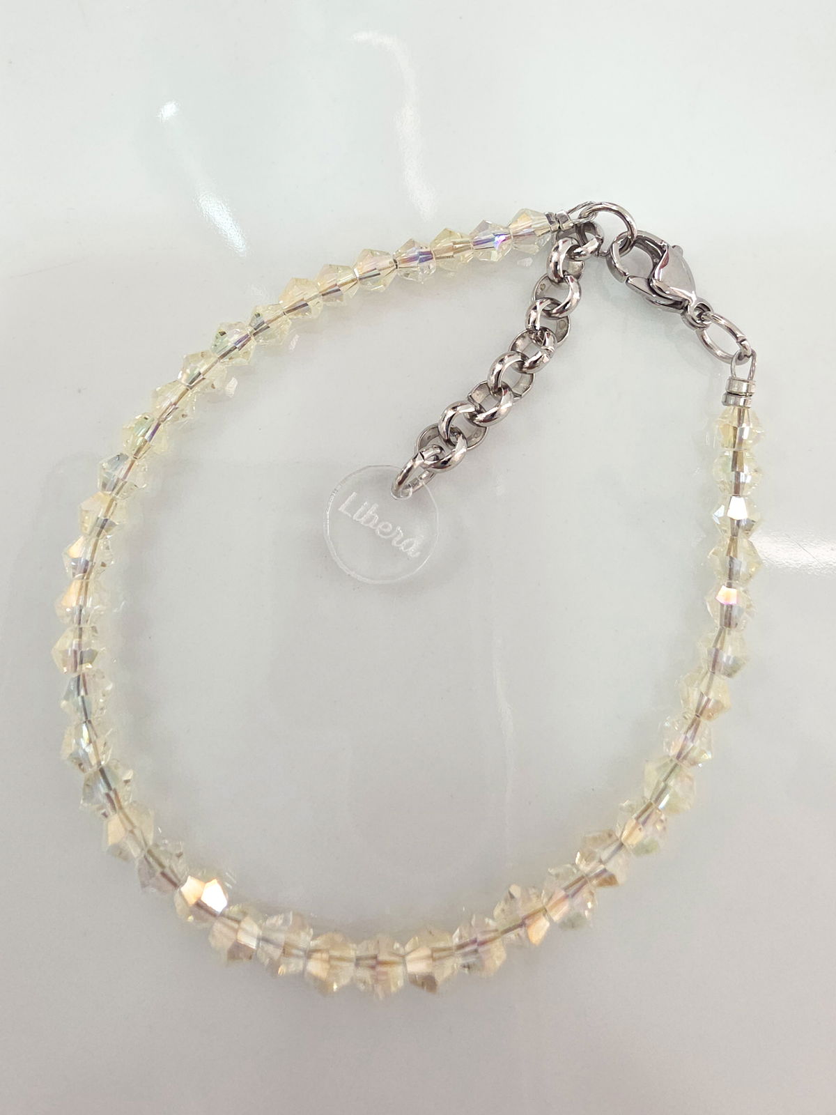 Pulsera compuesta por cristales cónicos. Detalles, cierre y cadena de Acero Quirúrgico 316l.