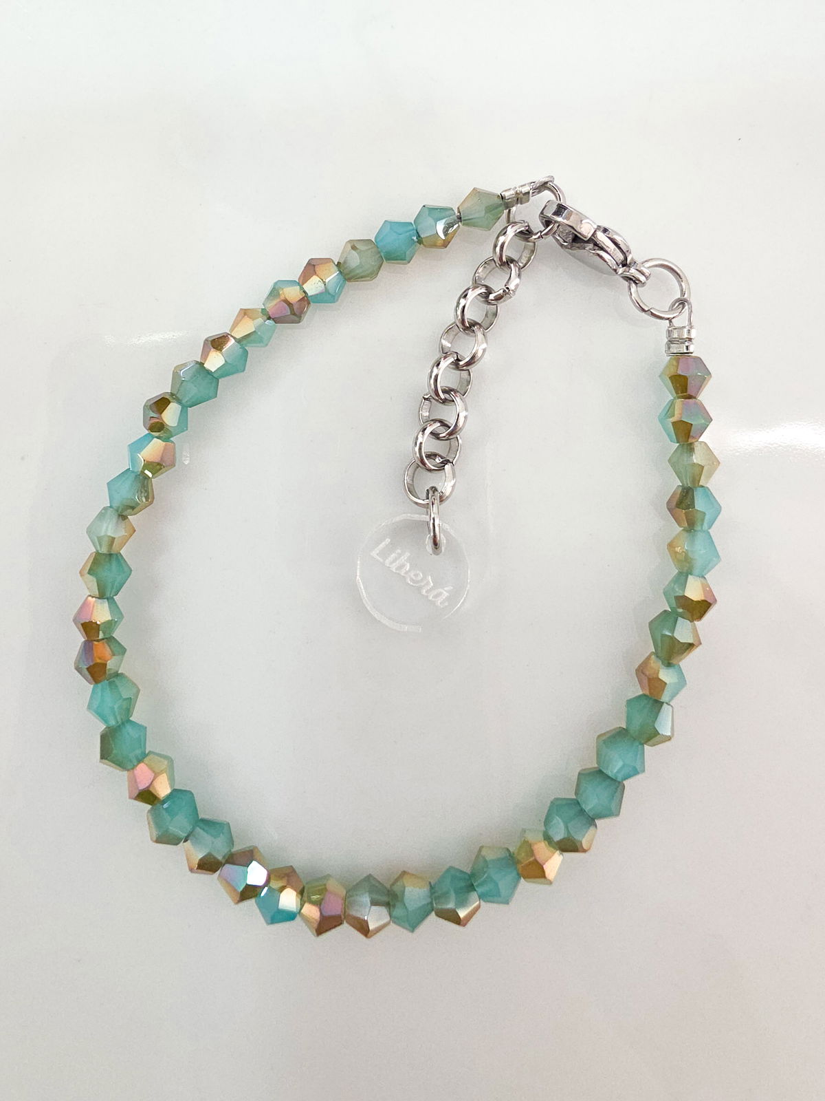 Pulsera compuesta por cristales cónicos. Detalles, cierre y cadena de Acero Quirúrgico 316l.