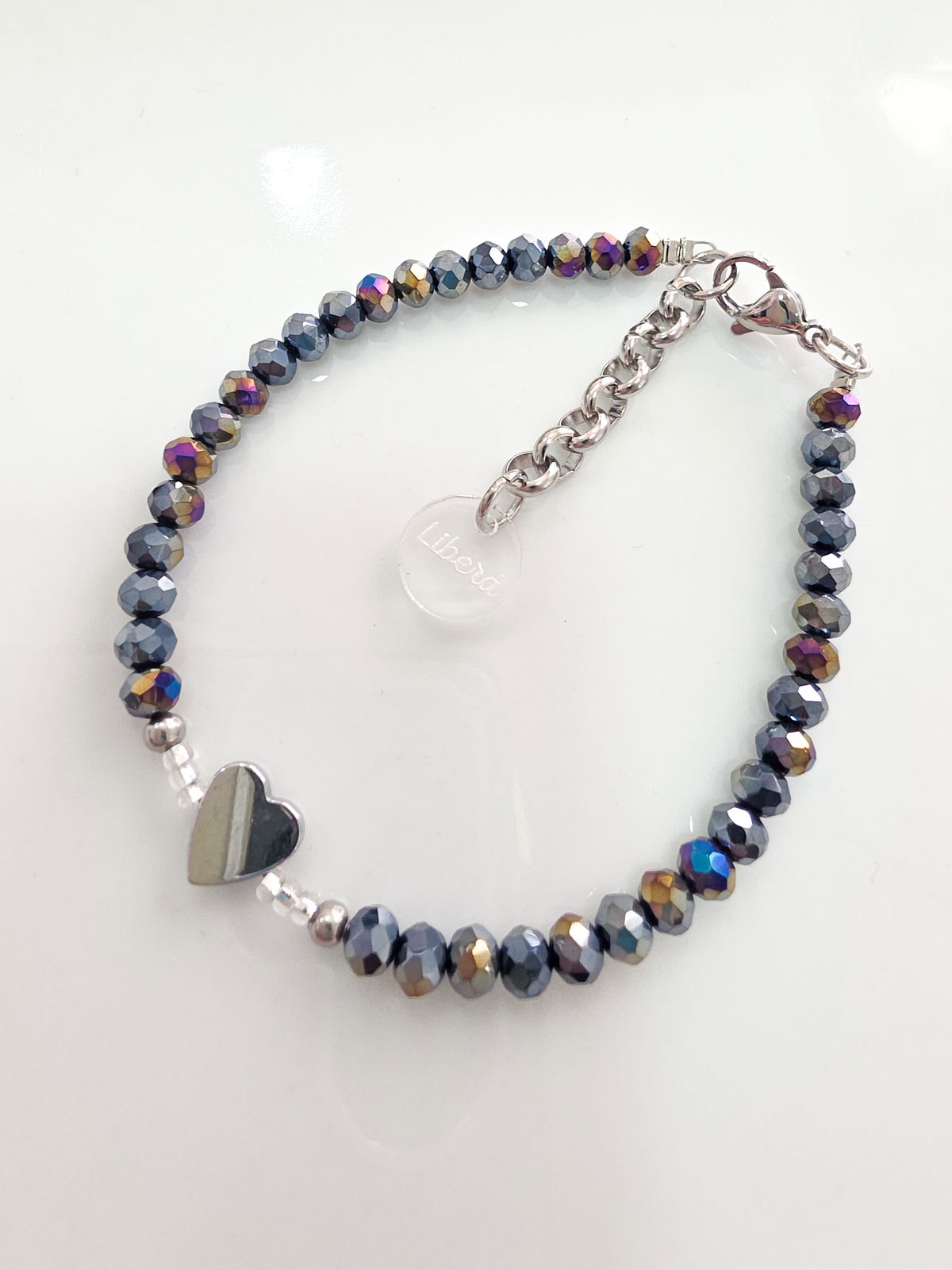 Pulsera compuesta por cristales y corazón de Hematite. Detalles, cierre y cadena de Acero Quirúrgico 316l.